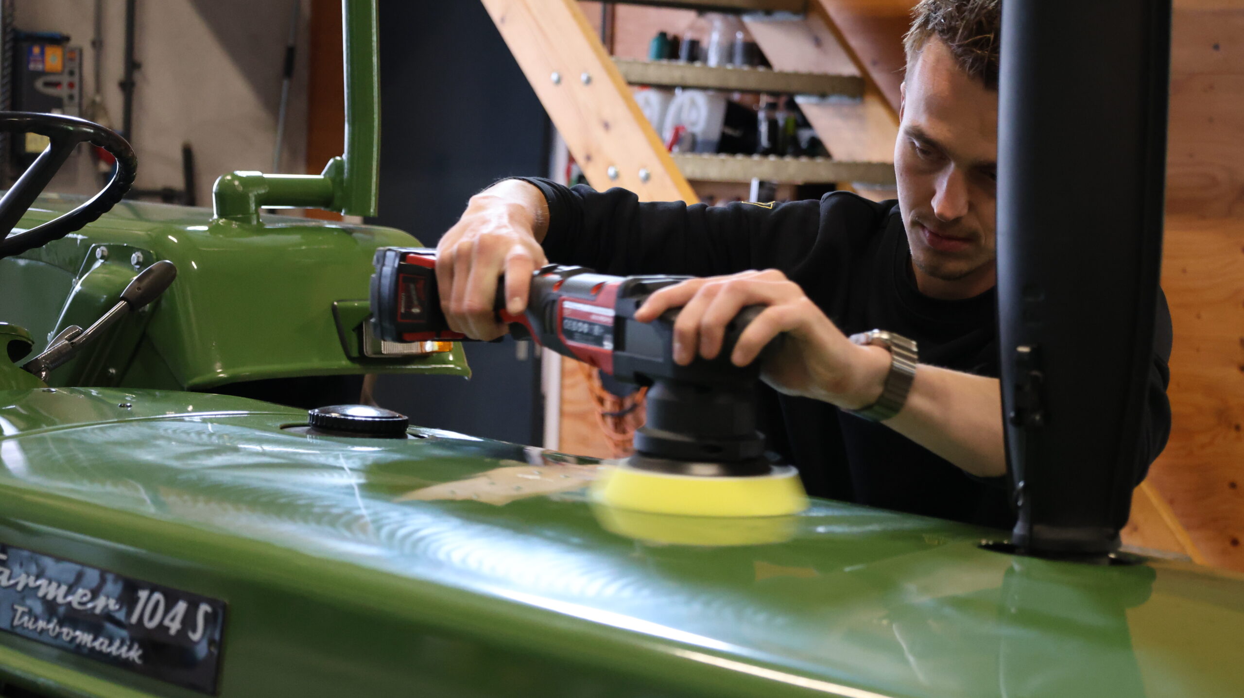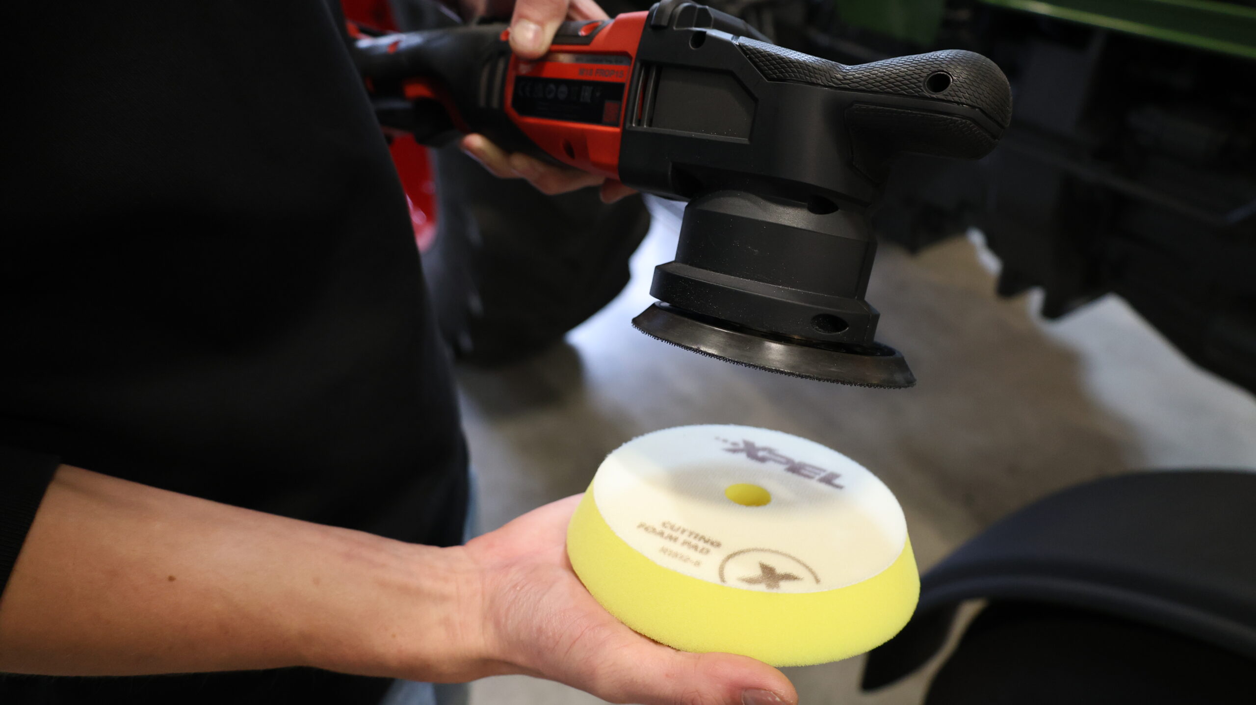 De trekker moet natuurlijk gewassen zijn voordat je begint. Daarna pasen we het polijsten toe om de lak weer op te frissen naar een glanzend effect. Hiervoor gebruiken we de Xpel foam pad medium 5" voor, en de Xpel medium polijst middel. Dit om de lichter verweerde lak op te polijsten zodat we na deze stap kunnen afwerken met de Xpel finish pad en polijst middel om de glans op de lak te krijgen door de fijne korrel die de finish polijst middel heeft.