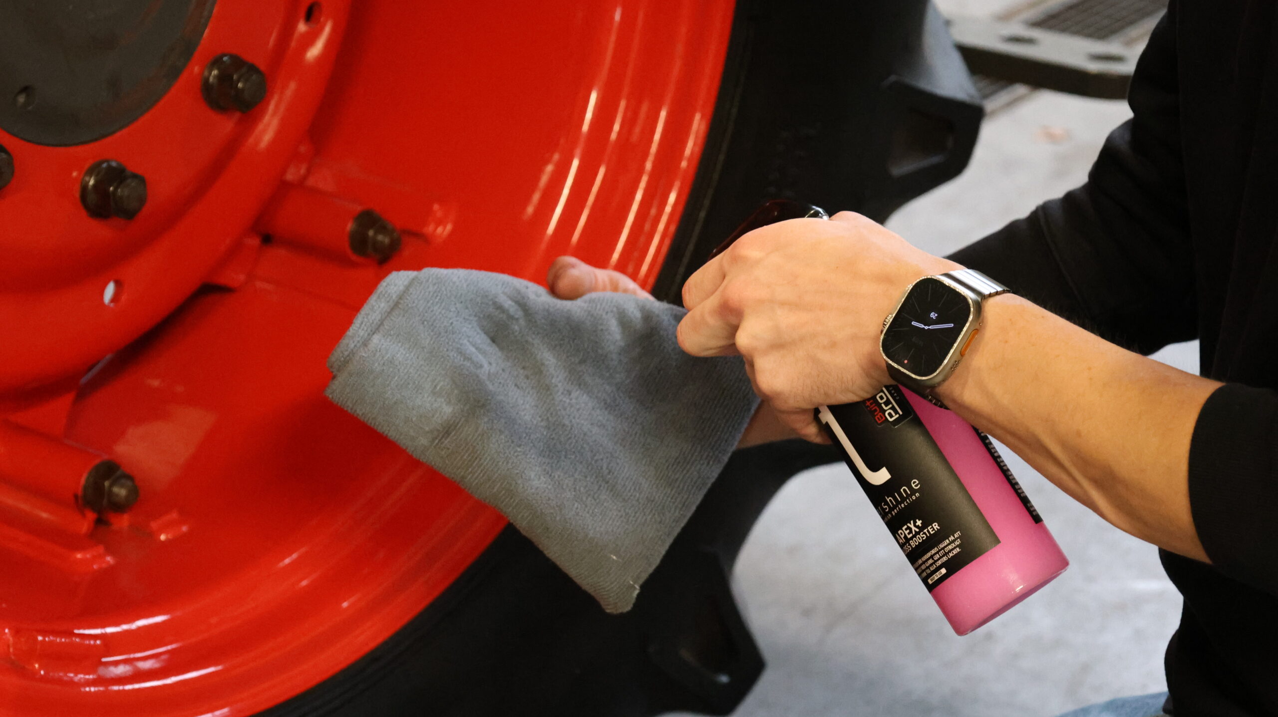 De velgen kunnen we niet vergeten natuurlijk! Om deze lastig te polijsten zijn gebruiken we de Gloss Booster. Dit geeft de velg extra glans en laat de lak nog extra er uit poppen met de reflectie van licht er op! Spuit wat op de doek of op de velg, wrijf het in, en draai vervolgens de doek om het overtollige weg te halen voor een geheel! en geniet van de extra glans.