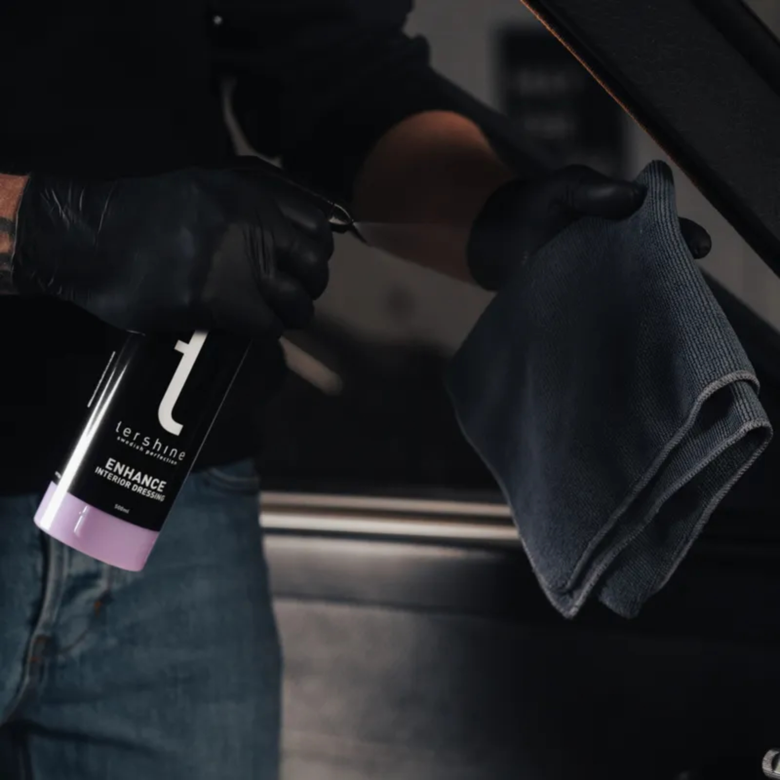 3️⃣ Apply Enhance Dressing evenly with a clean cloth.
