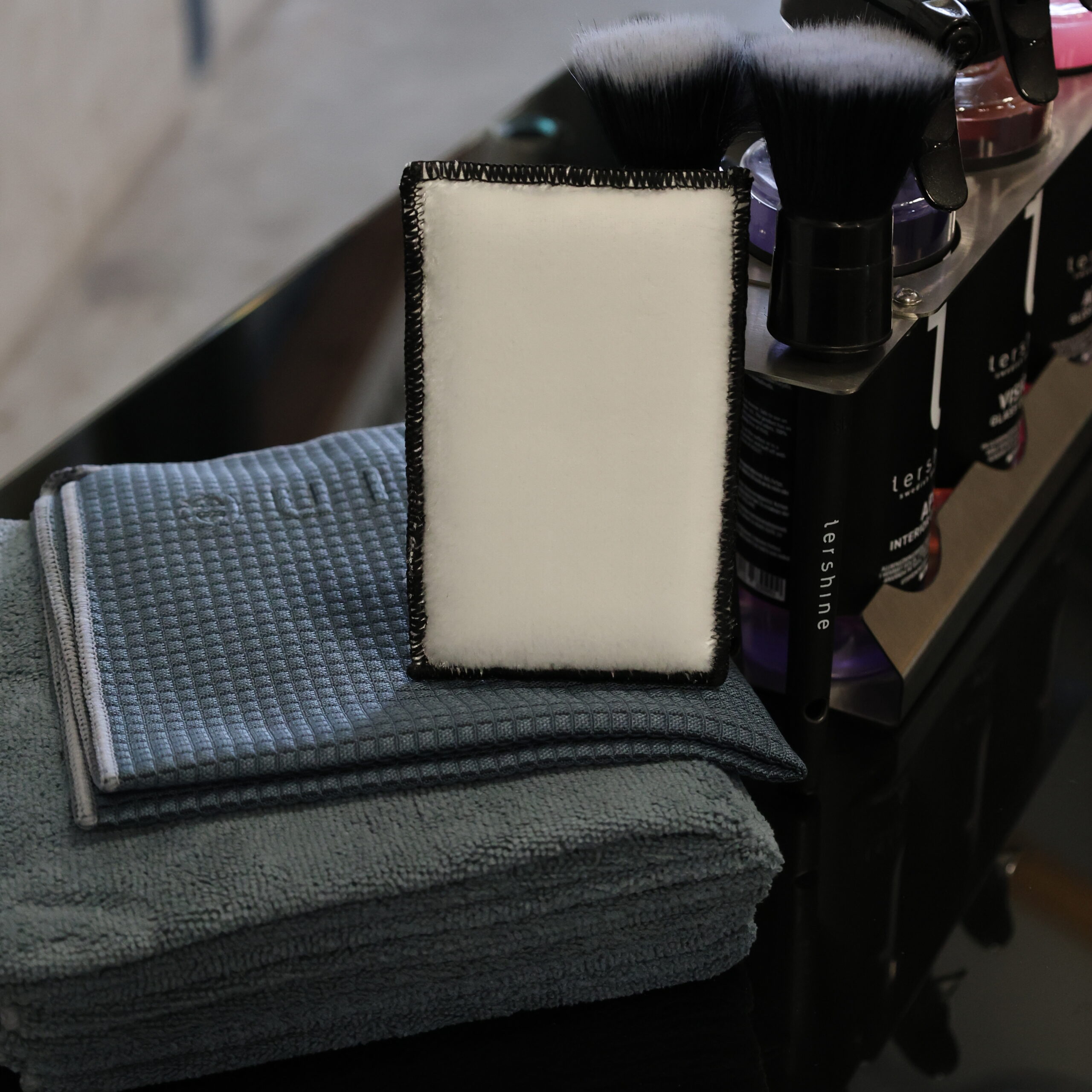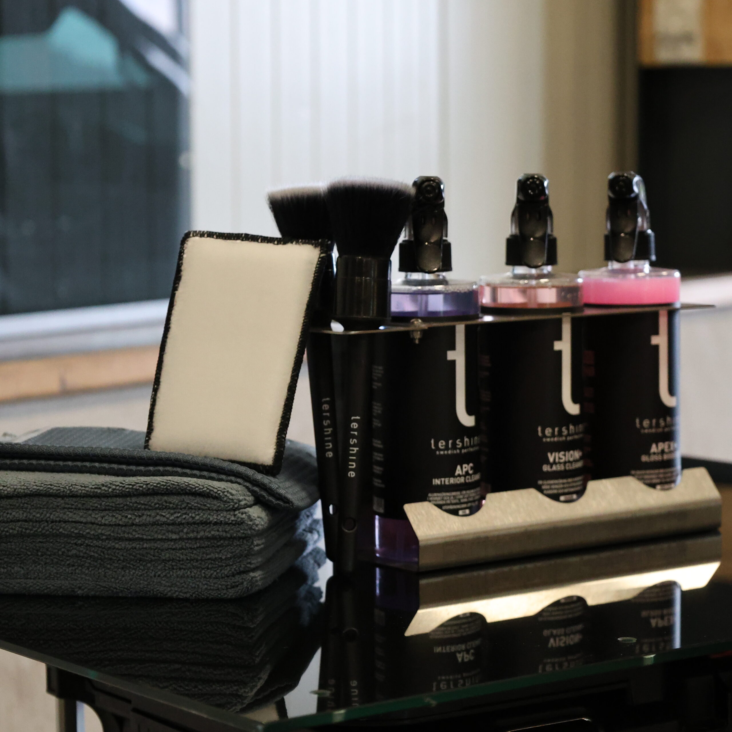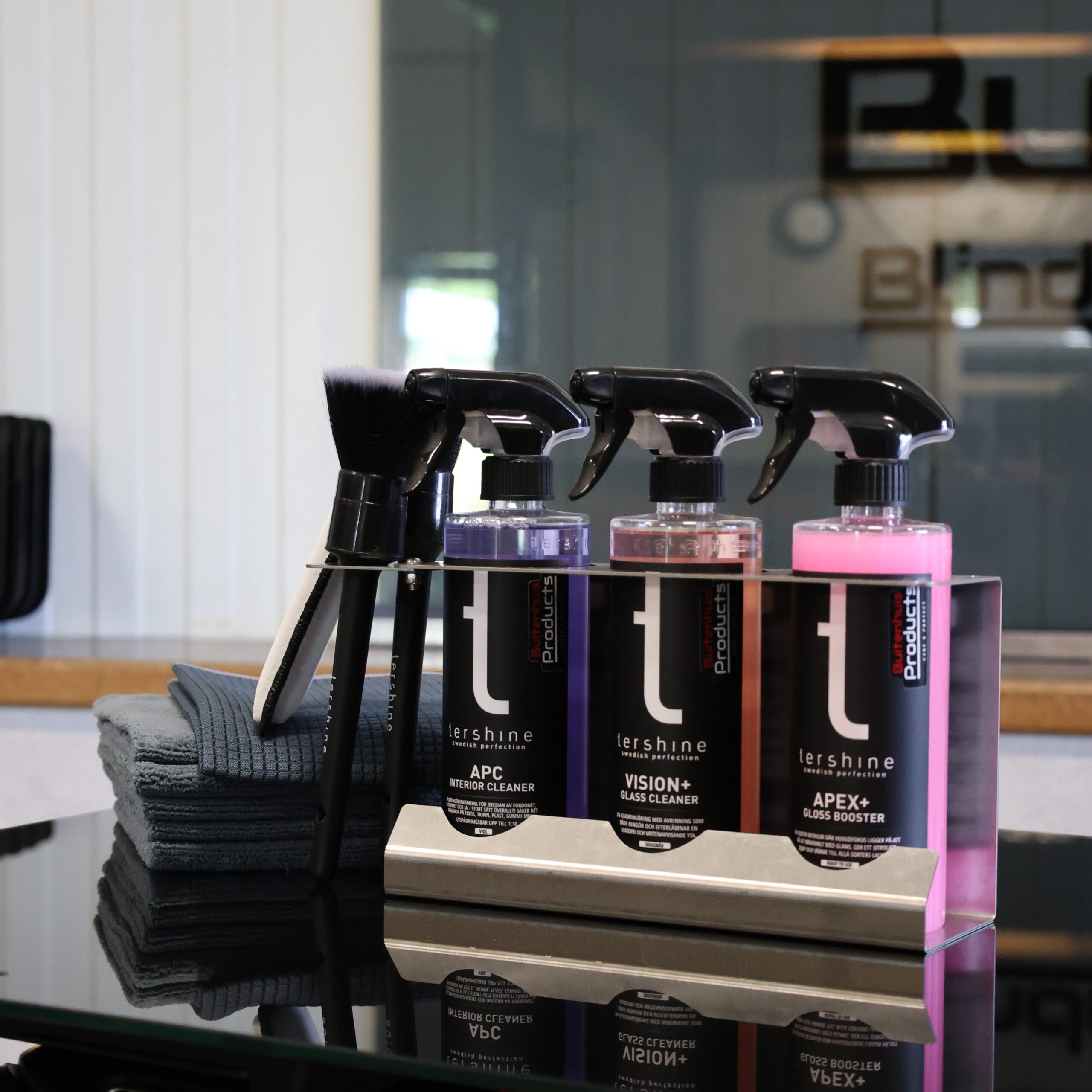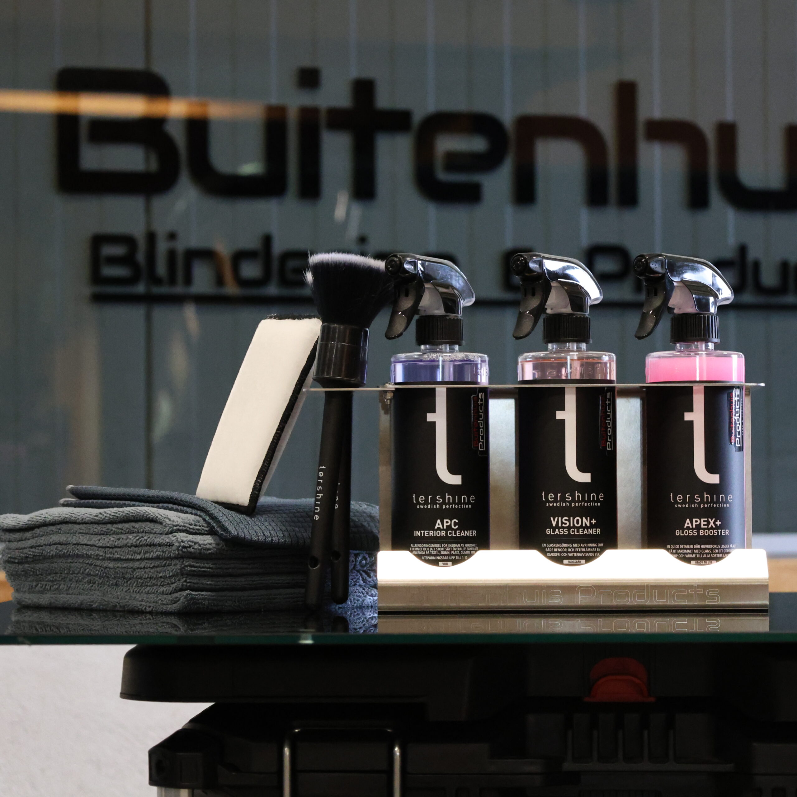 Deze versie wordt geleverd als compleet gevuld pakket, inclusief hoogwaardige reinigingsproducten: interieurreiniger, glasreiniger en glansbooster. Daarnaast bevat het pakket twee zachte kwasten, een schrob spons, een glasdoek en vijf microvezeldoeken. Alles wat je nodig hebt voor een schone en professionele werkplek, direct binnen handbereik.